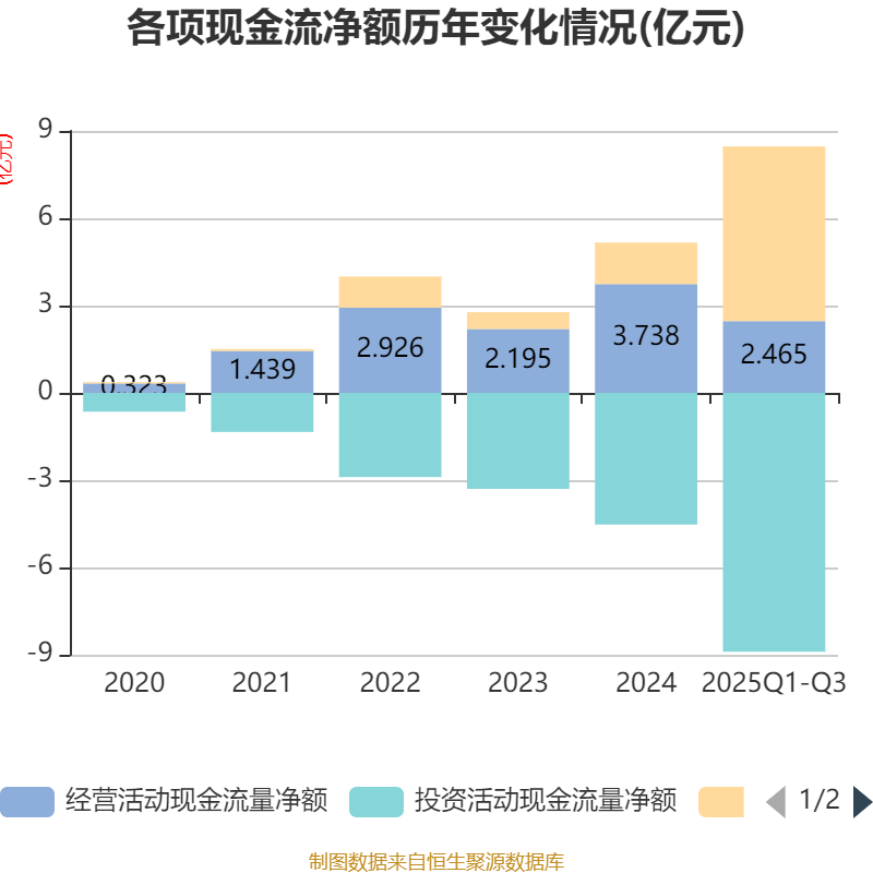 2025年前三季度,公司经营活动现金流净额为2.47亿元,同比增长4.29%;筹资活动现金流净额6亿元,同比增加4.22亿元;投资活动现金流净额-8.9亿元,上年同期为-3.69亿元。
